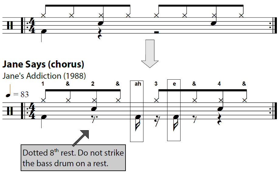 Sixteenth-note phrasing can be accomplished by placing a bass stroke in between the hi-hats. Check out how this technique is used in Jane Says—Jane’s Addiction (1988).